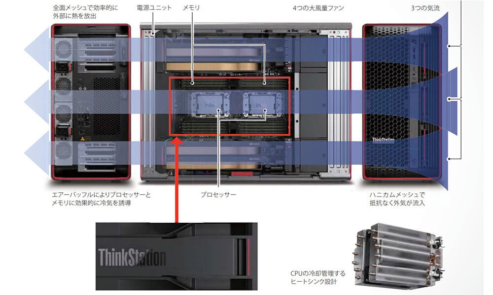 ThinkStation シリーズは、Intel Xeon W プロセッサーや AMD Ryzen Threadripper PRO プロセッサーに対応し、VR/MR、AI、機械学習、データサイエンス、解析などの高負荷ワークロードに最適化されています。