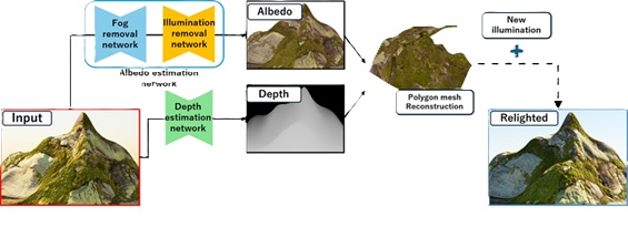 しかし、山岳風景の場合、霧や大気散乱の影響が強く、また、植生や岩場などが複雑に混在するため、アルベド(物体固有色)や深度の推定精度が大きく低下するという課題があります。