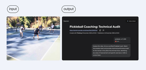 イメージやビデオを読み込みその内容を理解する。ピックルボール(Pickleball)の試合のビデオを入力し(下の写真、左側)、Gemini 3に「右手前のプレーヤの動きを解析し、スキルを向上するためのアドバイス」を求めると、モデルは「パドル(ラケット)の位置が下がる傾向にあり、常にお腹の高さに構えておくこと」と助言した(右側)。