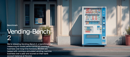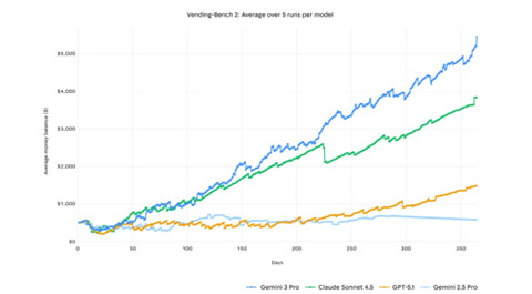 AIエージェントのコア技術でGemini 3は計画機能が大きく向上した。計画能力を査定するベンチマークの代表が「Vending-Bench 2」で、AIエージェントが人間に代わり自動販売機の管理を司り、指定された期間の収入を比較するものとなる(下の写真)。