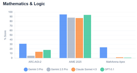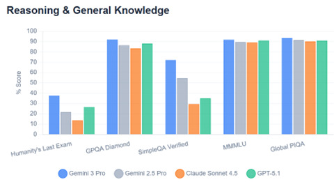 Gemini 3は推論機能が大幅に強化され、全てのベンチマークテストで競合他社のモデルの性能を上回った。