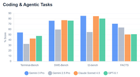 Gemini 3はコーディング機能で他社を上回ったが、「SWE-Bench」でClaude Sonnet 4.5に及ばなかった。