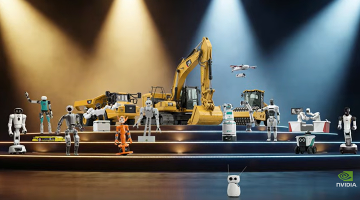 Nvidiaの基調講演はロボットが主役でヒューマノイド・ロボットからショベルカーまで多彩な形状のモデルが登場した(下の写真)。