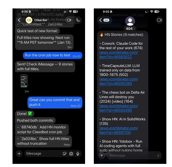 OpenClawはオープンソースとして公開されており、これをダウンロードして、個人専用のAIエージェントを構築する。(下の写真、SignalでAIエージェントに命令(ニュースの要約を作成) (左側)、AIエージェントは結果をApple iMessageに出力(右側))