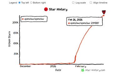 絶大な人気を博し、2月のダウンロードの回数が23万件を超えた(下のグラフ)。OpenClawの開発エコシステムが急激に広がり、多彩なAIエージェントが生み出されている。