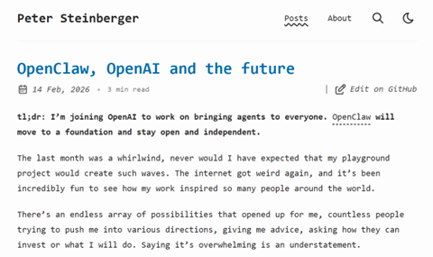 OpenClawの開発者であるSteinbergerは今週、OpenAIに移籍することを明らかにした。